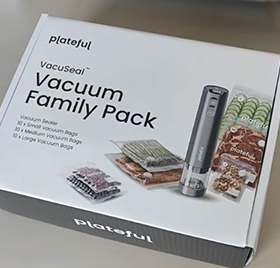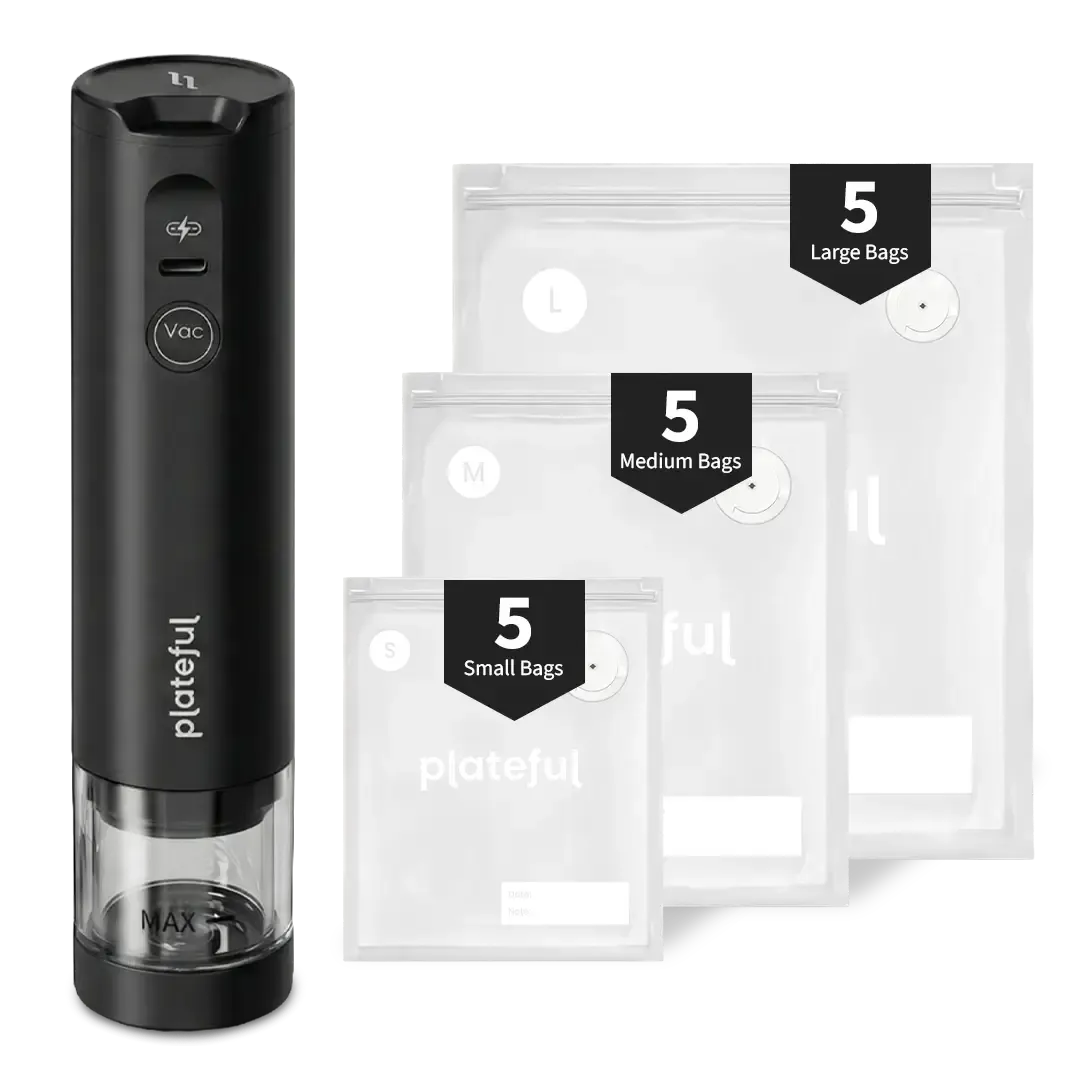 VacuSeal™ works with all Plateful vacuum bags. Every order comes with 15 bags in 3 sizes (5 small, 5 medium, 5 large).